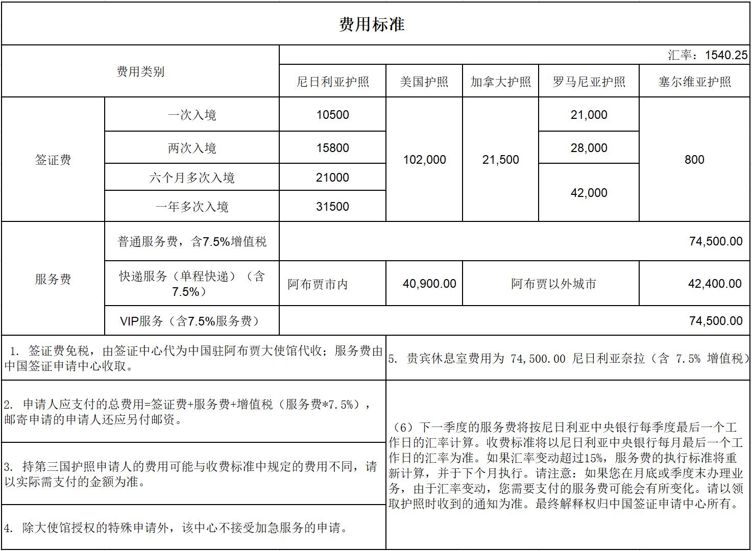 各项收费一览表(单位:奈拉)