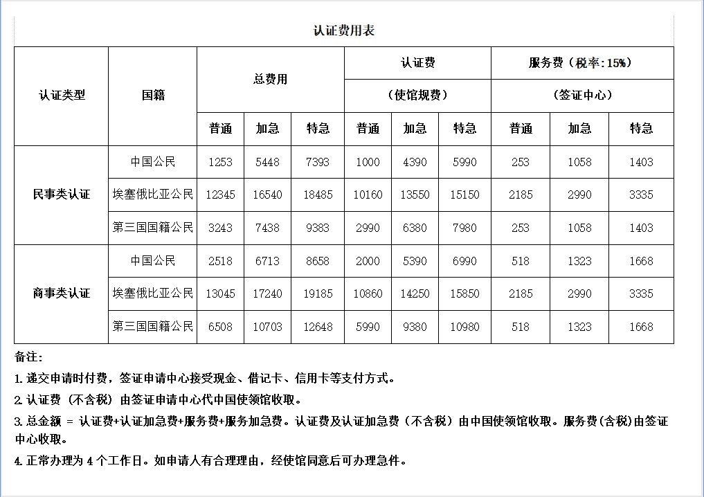 自2024年以来,埃塞比尔兑美元汇率持续大幅波动。根据中心2025年8月通知,以及中心业务运营实际及相关工作安排,签证中心定于2025年10月31日起执行第二阶段服务费调整安排,按照10月21日汇率调整至30美元/件计价标准,并同步按照中国驻埃塞俄比亚使馆于2025年9月30发布的通知要求调整签证费和认证费(网址:https://et.china-embassy.gov.cn/lsxx_1/lszj/lingshi123/202509/t20250930_11720756.htm)。具体费用变化如下: