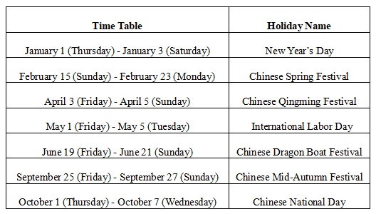 The holidays for the Consular Section of the Chinese Embassy in Egypt in 2026 are as follows. Temporary adjustment will be announced on the website of the Chinese Embassy in time(if any), please follow in due course.