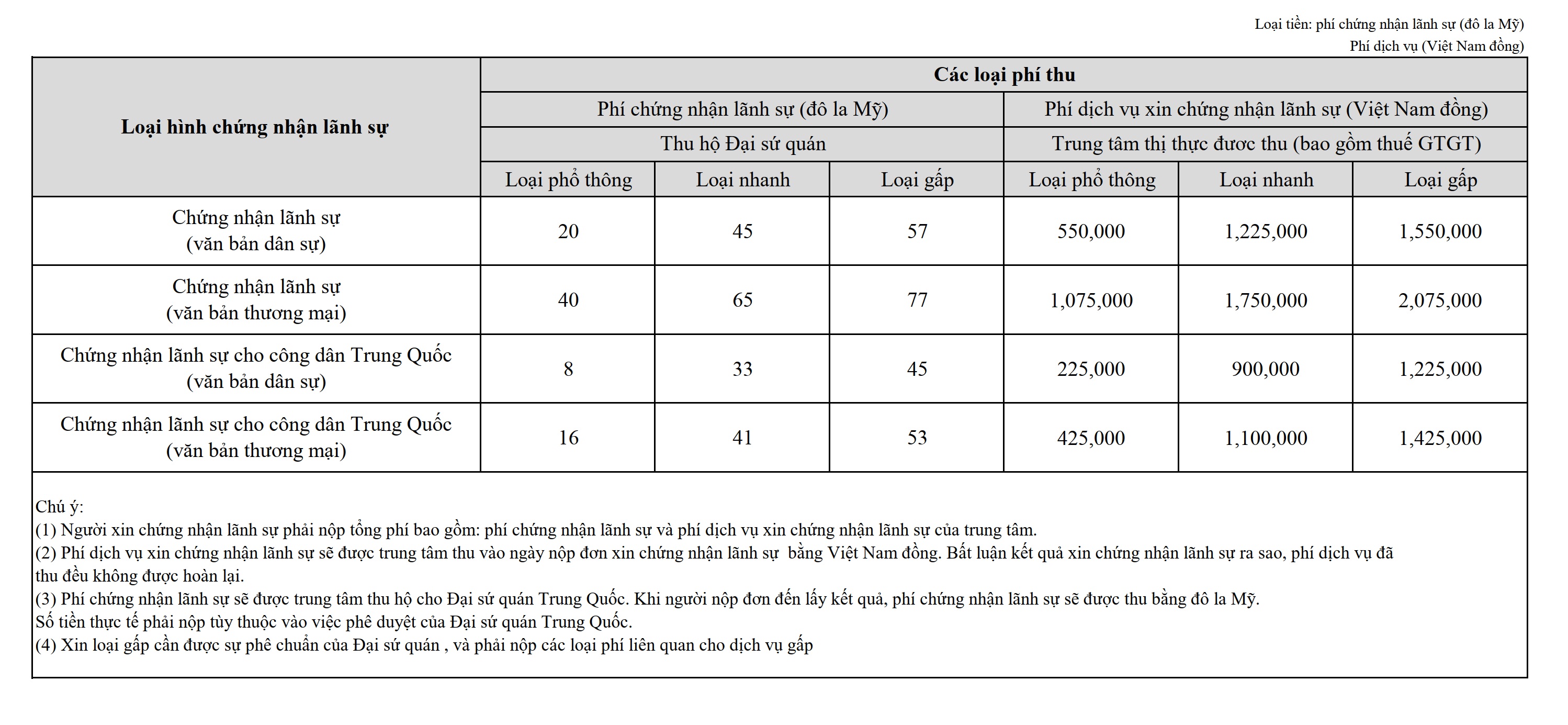 3. Phí chứng nhận lãnh sự được trung tâm thu hộ cho Đại sứ quán Trung Quốc. Phí chứng nhận lãnh sự sẽ được thanh toán bằng đồng Đô la Mỹ khi quý khách đến Trung tâm nhận kết quả. Số tiền thực tế phải nộp tùy thuộc vào việc phê duyệt thị thực của Đại sứ quán Trung Quốc.