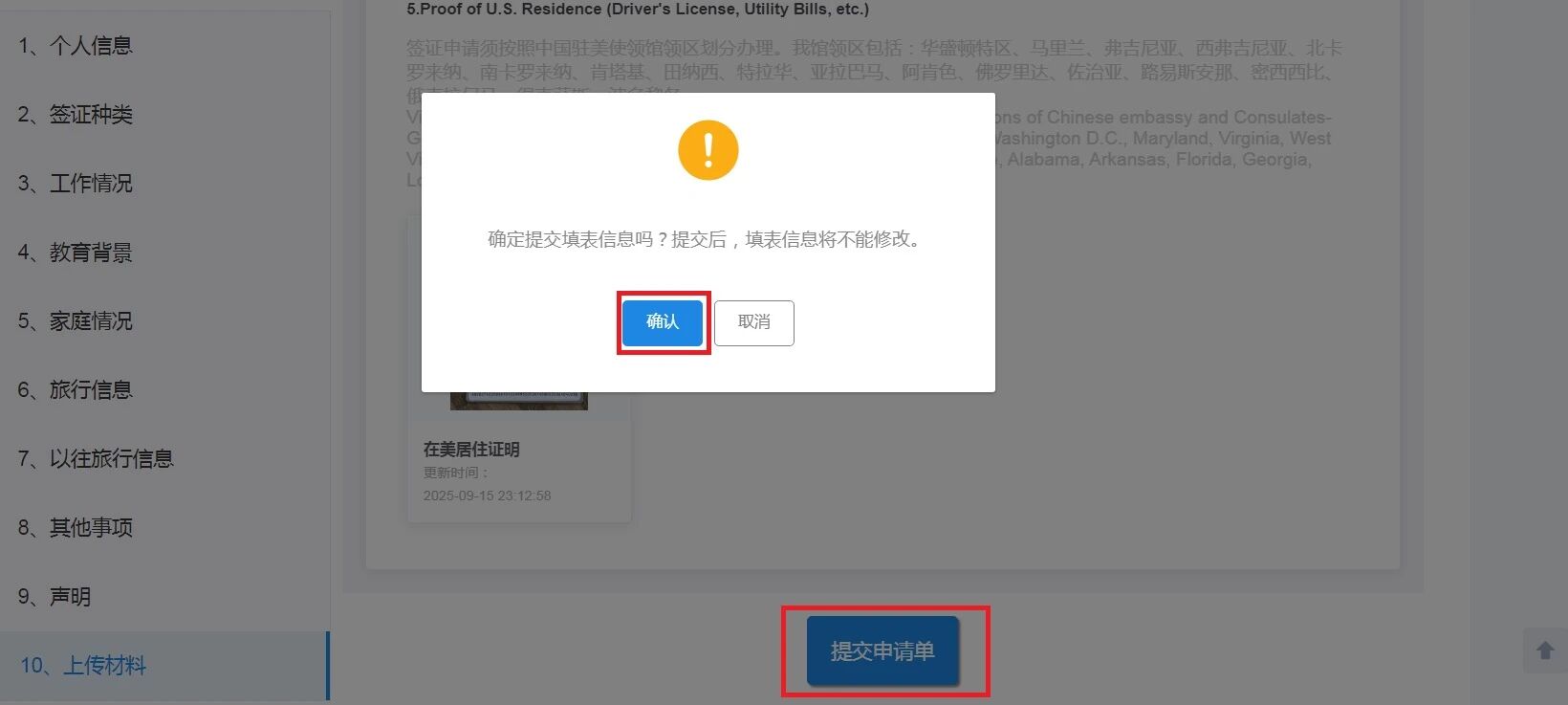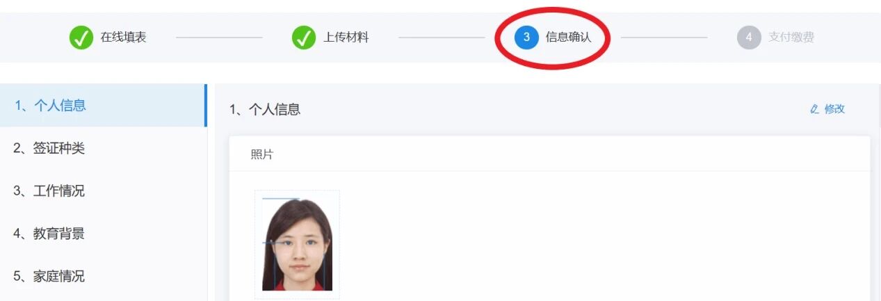 完成材料上传后点击【下一步】即进入信息确认环节,可在此环节浏览复核已填写信息和上传材料。如需修改,请点击页面右上方【修改】按钮。确认无误后请点击【提交申请单】。请务必仔细核对信息,提交后填表信息将不能修改。