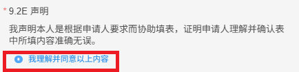 3.12 在声明页,请选择填写人身份(本人或代填写人,代填写人需说明个人信息及与申请人的关系),阅读同意声明内容后勾选下方【我理解并同意以上内容】。