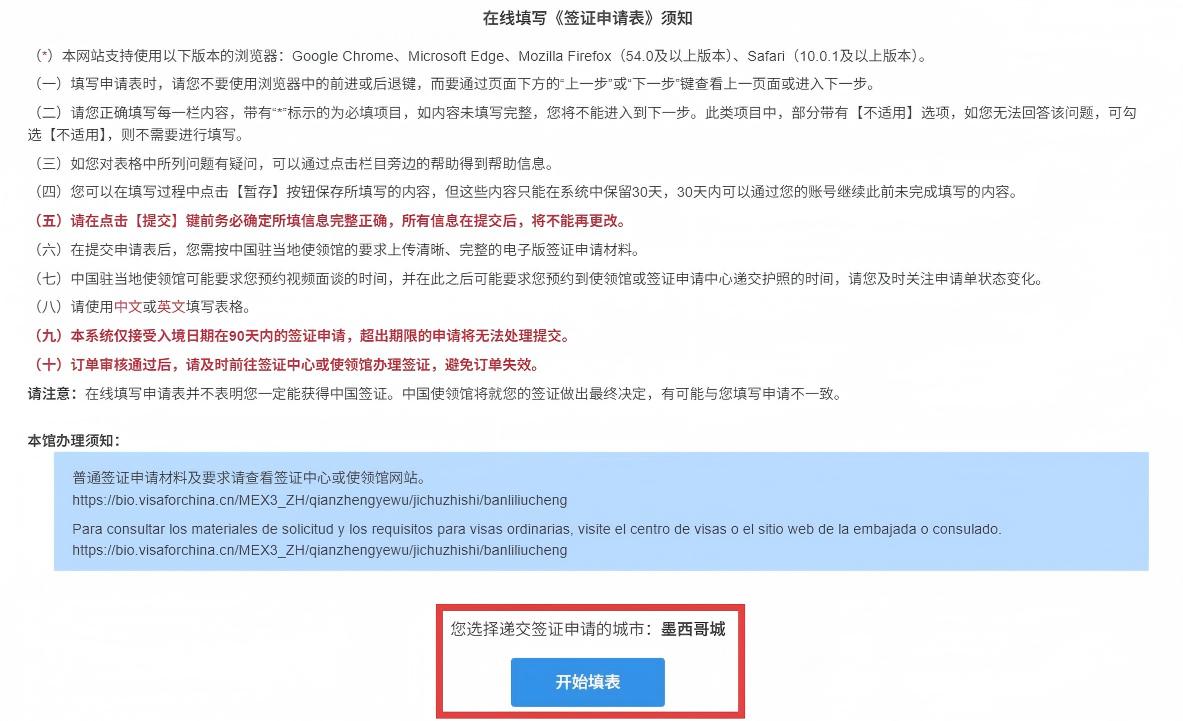 1. 请仔细阅读“在线填写《签证申请表》须知”后点击【开始填表】,即可开始填写申请表。