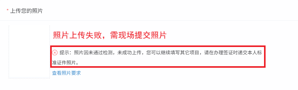 3.1 上传个人照片时,系统支持照片拖动裁剪并自动判定上传照片是否合格。如多次上传照片均未通过检测,可继续填写其它项目,待到中心提交时上交标准证件照片。