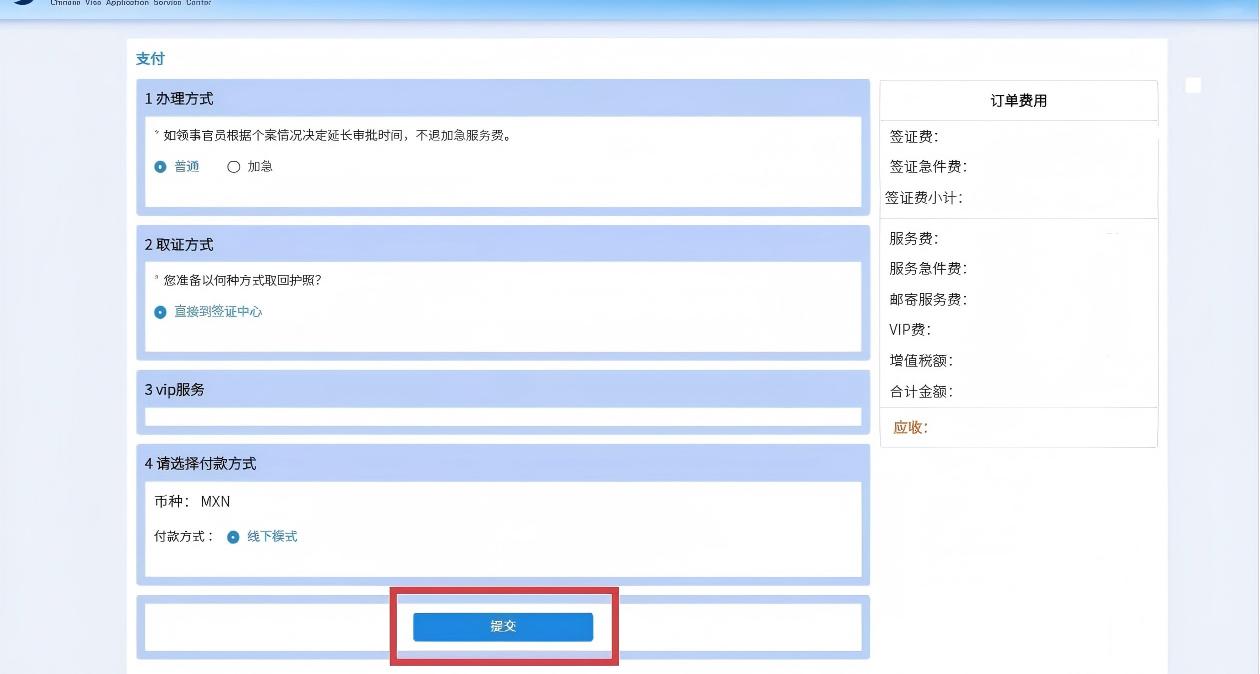 请注意: 必须在确认费用页面点击【提交】按钮,否则订单状态将为“Pending payment”,无法进行审核。