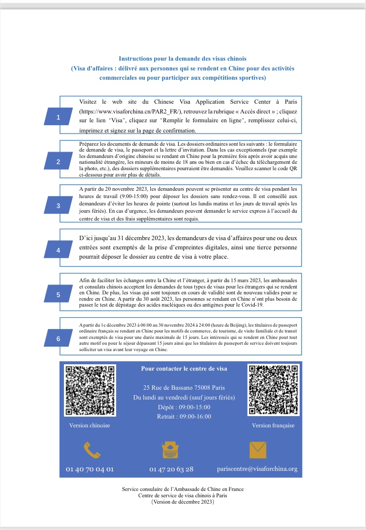 Instructions pour la demande des visas chinois -Visa d'affaires