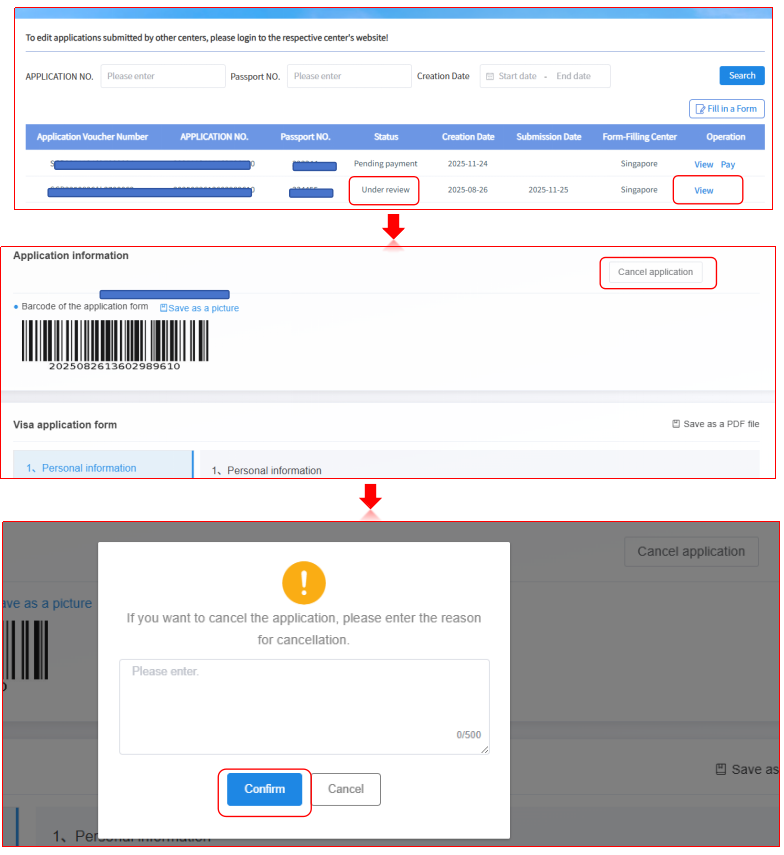 When your application status is “Under review”, if you need to cancel your application due to a trip cancellation or other personal reasons, please click “View” on the right side of the list. After the page displays, click the “Cancel Application” button in the upper right corner, fill in the reason for cancellation, and confirm. Normally, the visa center will assist you in canceling the application within 48 hours on working days.