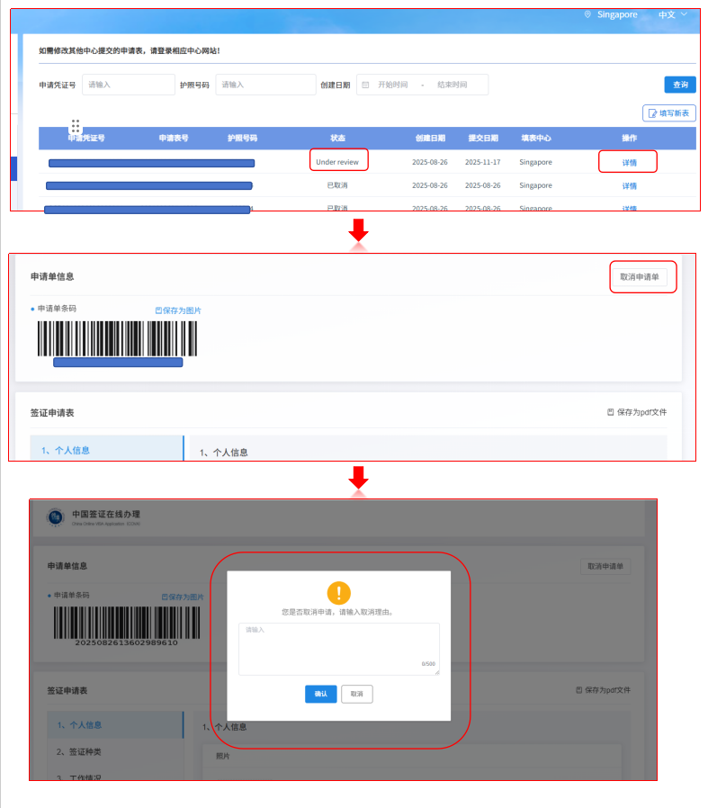 通常情况下,同一本护照不能同时提交两份及以上签证申请表。如因填错国家、取消行程、变更赴华目的等情况需重新申请,请先取消当前申请,之后方可填写新表。如何取消线上提交的申请,请参照以下做法: