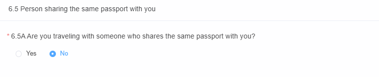 3.9 【 Person sharing the same passport with you】se aplica solo cuando alguien que viaja con usted utiliza el mismo pasaporte. Si viaja con otras personas que tienen pasaportes diferentes, por favor seleccione "No" para esta entrada.