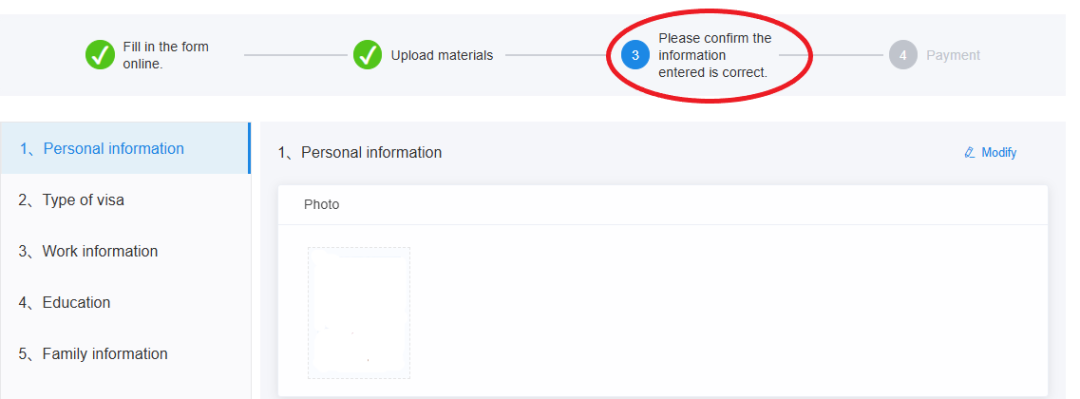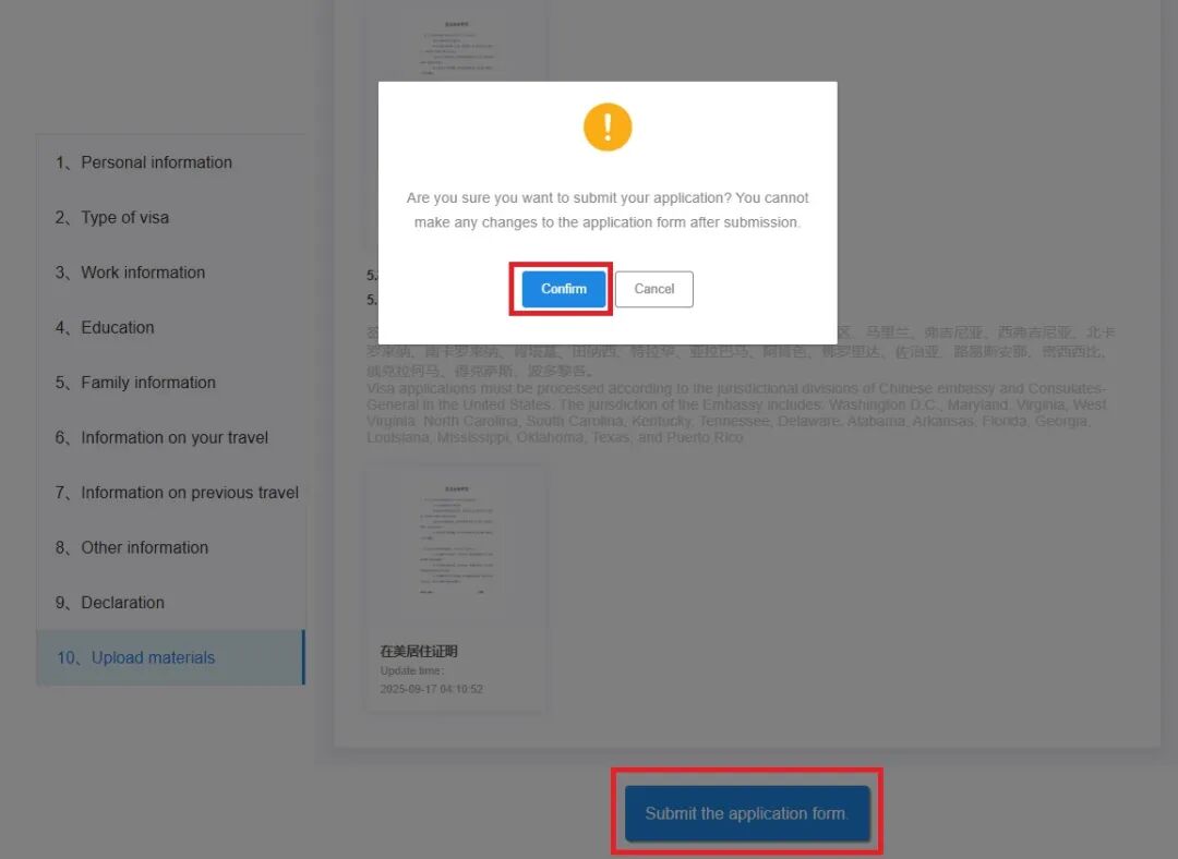 Después de cargar los materiales, haga clic en 【Next】para proceder a confirmar su información. Aquí, puede revisar la información enviada y los materiales cargados. Para realizar cambios, haga clic en el botón 【Modify】 en la esquina superior derecha de la página. Una vez confirmado, haga clic en 【Submit the application form】. Por favor, revise cuidadosamente toda la información, ya que el formulario enviado no se puede modificar hasta la revisión de los funcionarios consulares.