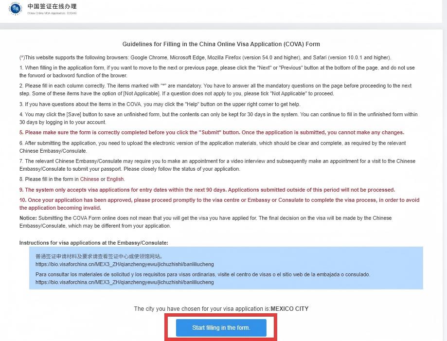 1. Después de leer cuidadosamente las "Instrucciones para el Formulario de Solicitud de Visa en Línea", haga clic en el botón 【Strat filling in the form】 para comenzar a completar el formulario.