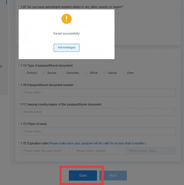 El formulario en línea requiere completar un total de 9 secciones, a saber: Información Personal, Tipo de Visa, Situación Laboral, Formación Académica, Detalles Familiares, Información del Viaje, Historial de Viajes Anteriores, Otros Asuntos y Declaración. Por favor, complete el formulario secuencialmente en chino o inglés. Después de completar todos los campos obligatorios (marcados con *) en una sección, haga clic en 【Next】 para continuar.